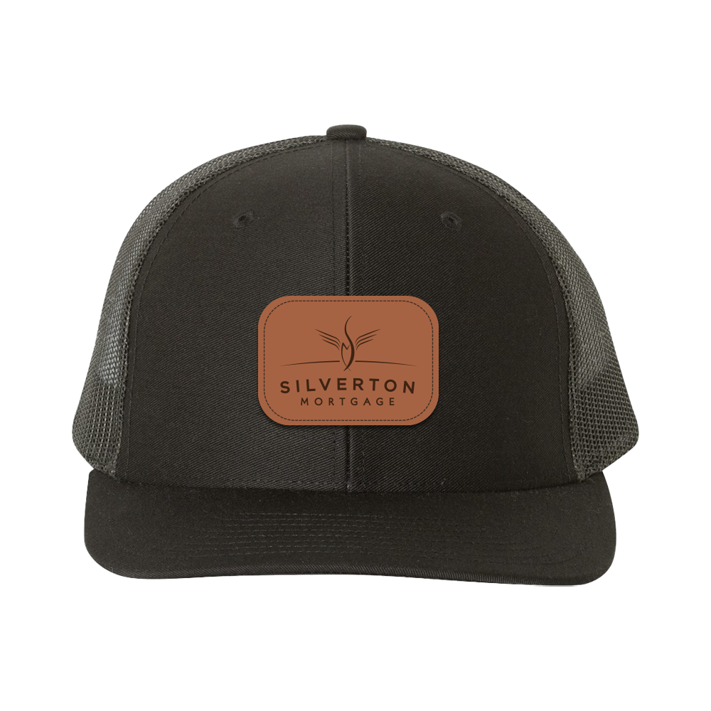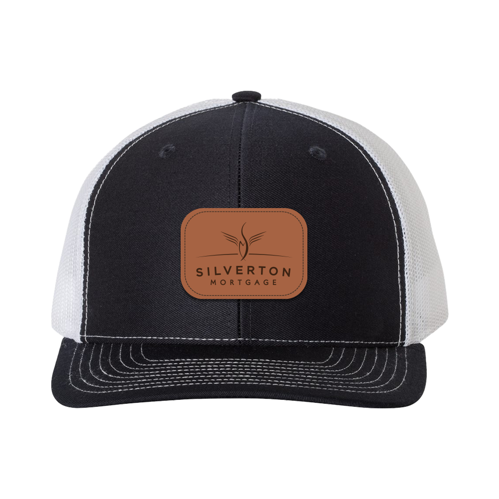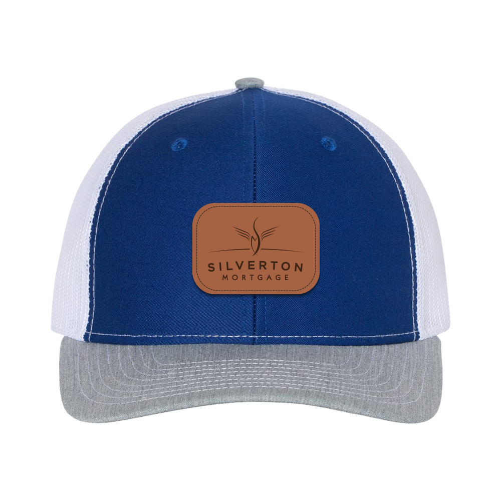 A Richardson 112 structured, six-panel, mid-profile hat with pre-curved visor and adjustable plastic snapback. Constructed of 60% cotton / 40% polyester with a 100% polyester mesh back. Includes genuine leather patch decoration on front. One size fits most.
